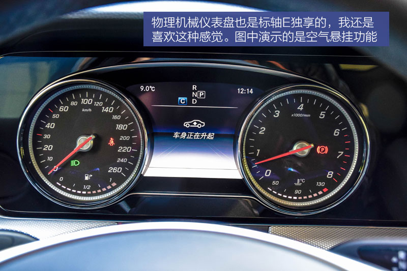 标轴E200的物理仪表盘也是颇有争议,我听好几个人提到这个物理仪表盘和E级整体仪表和中控液晶设计格格不入,但我必须说,萝卜青菜各有所爱,我本人就特别喜欢这种物理仪表盘,我觉得很别致,而且对于这种显示时速和转速的关键部件,我还是更加信赖机械!