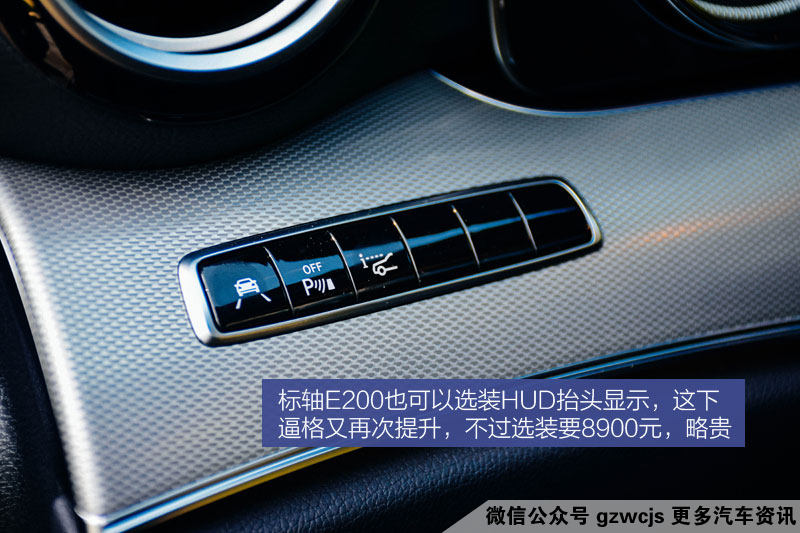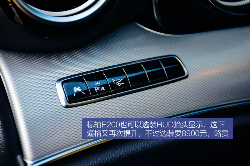 标轴E200也可以选装HUD(抬头显示,奔驰叫平视显示),选装价格8900元,略贵,如果能控制在5000元内,将会成为我第二推荐选装的配置。