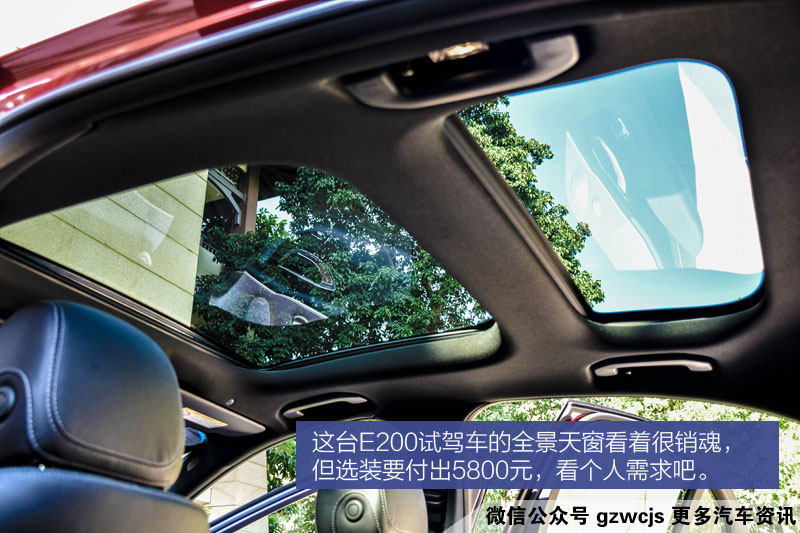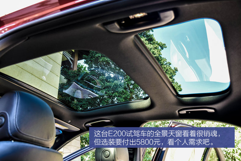 这台标轴E200试驾车的全景天窗看着是很销魂的,前半部分打开的面积也令人满意。不过,E200车型是需要选装的,价格5800元,如果你购买的是E300,则是标配,不用花钱了。