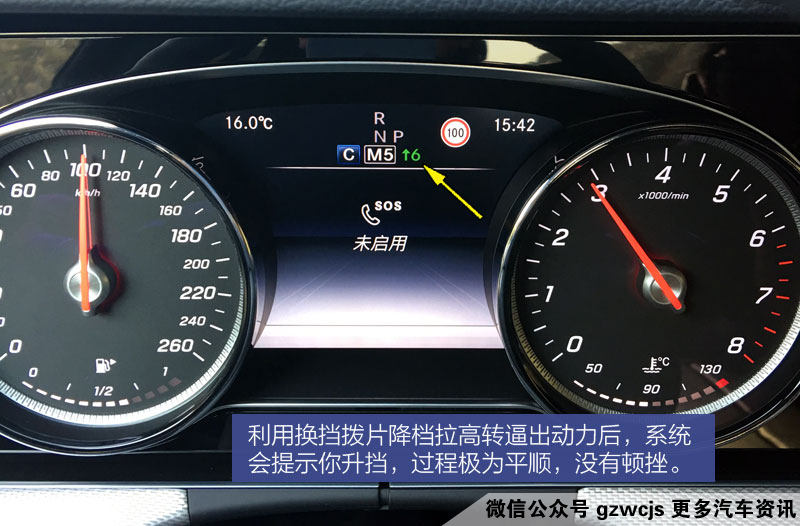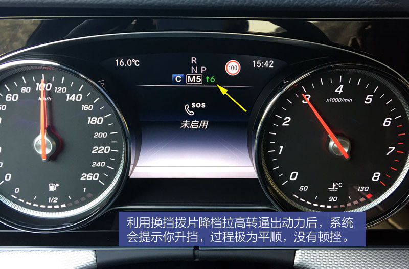 不过也不必担心,当你需要超车时,只要用拨片换挡稍微降一挡,动力立刻来了,等转速拉高后,仪表盘会提示你升挡,此时你按下右侧换挡拨片升挡,即可完成超车。