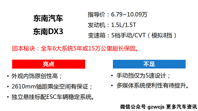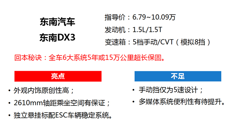 小编点评:当今90后已成为购车主力,面对首次购车的消费者,东南DX3拥有原创度高,运动感强的外观及内饰;2610mm轴距,四轮独立悬挂,众多实用配置将帮助东南DX3成为自主小型SUV的一员猛将。7.79万的手动尊贵型,标配ESC车身稳定系统,倒车影像,9英寸触摸屏,年轻人首次购车值得关注。