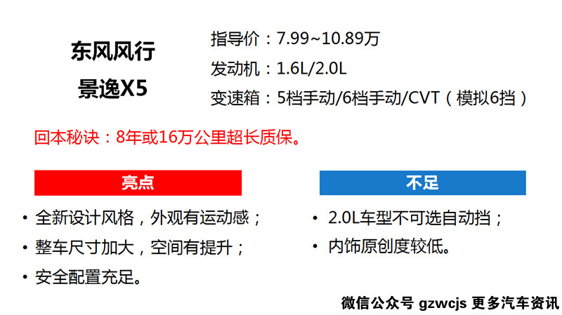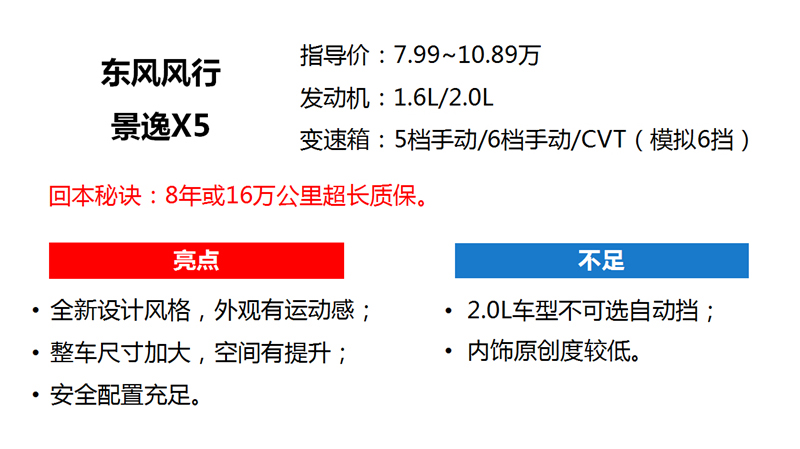 小编点评:新款景逸X5相比老款车型有质的飞跃,在车身细节优化,以及实用配置的加入,成为年轻人首次购车的理想选择。9.59万的1.6L手动尊享型还拥有前后排头部气囊,无匙启动/进入,后视镜电动折叠等实用配置。