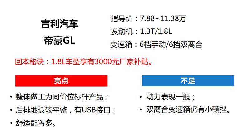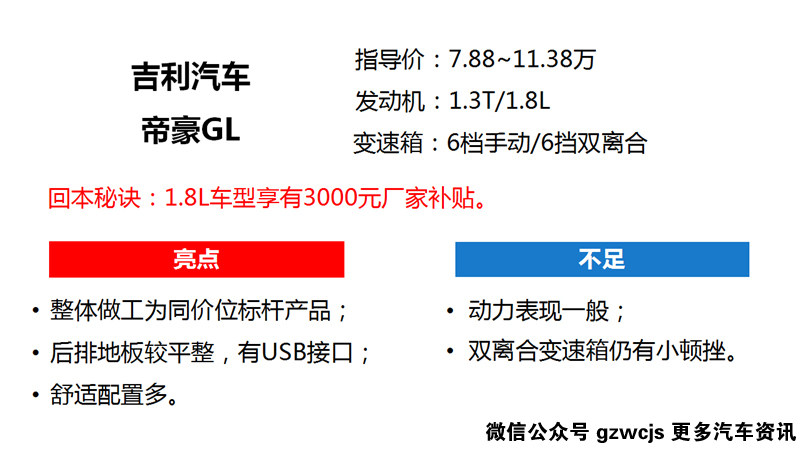 小编点评:自吉利博瑞上市以来,吉利一系列更新换代的产品,在外观、内饰、还是配置,一直处于同级别的标杆地位。而帝豪GL也将接过帝豪的衣钵,继续征战10万级别紧凑型家用车的市场。8.58万的1.8L手动精英型,正适合将要成家立室的年轻人。