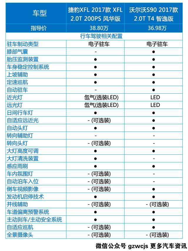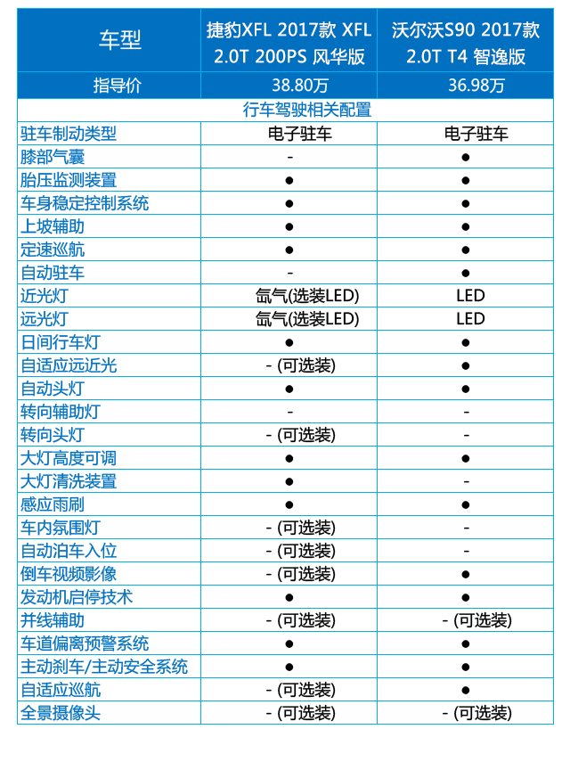 即便是最低配车型,两台车的配置表现也还是很厚道的,像是胎压监测、上坡辅助、定速巡航、自动大灯、自动雨刷这些基础配置两台车都有,通过对比可以看出,沃尔沃S90是稍微胜过捷豹XFL的。