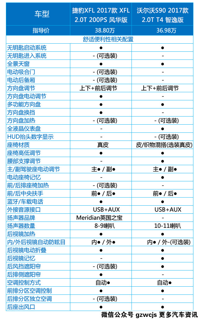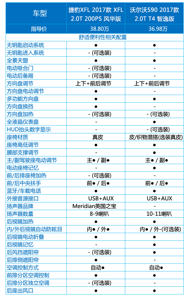 在驾驶安全相关配置方面S90略胜一筹,那么在舒适便利性配置方面就是XFL扳回一城了,除了两者都有的全景天窗、多功能方向盘、后视镜加热、后视镜电动折叠、自动空调、后排出风口等,XFL的方向盘是电动调节,并且带有方向盘换挡拨片,虽然说这些都不是经常用到,但却能够提供很好的用户体验,至于S90的全液晶仪表盘嘛,XFL只能在一旁羡慕了。