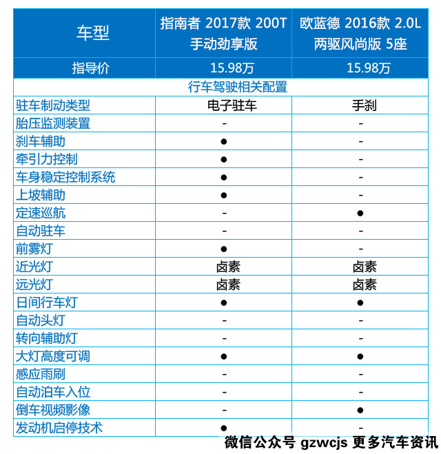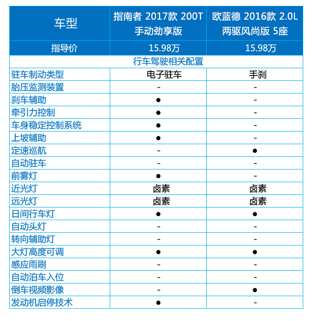 从对比列表中可以轻易看到,指南者明显要优于欧蓝德,装备了电子手刹、刹车辅助、牵引力控制和车身稳定控制系统,这些都是欧蓝德所没有的。车灯方面两车的光源都是卤素灯泡,这也是意料之中的,欧蓝德居然没有配备前雾灯却是感到有点意外,不过定速巡航倒是挺实在的。