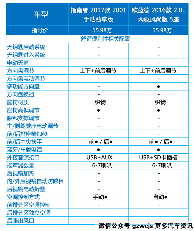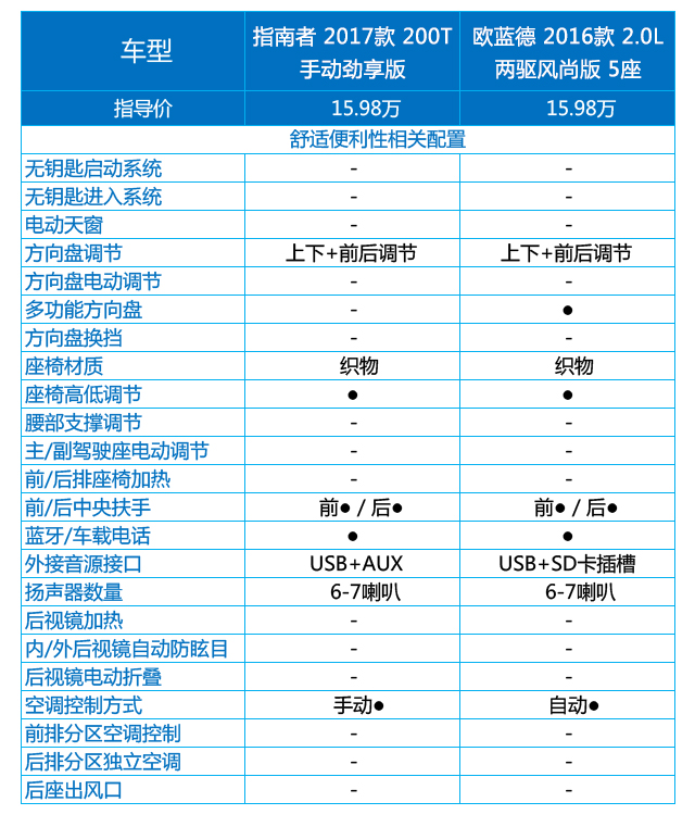 但是话又说回来,都已经是16万的车了,无钥匙进入/启动都没有,天窗也没有,要买指南者的推荐2017款 200T 自动家享版,指导价17.98万,要买欧蓝德的推荐2016款 2.4L 四驱精英版 5座,指导价18.98万。