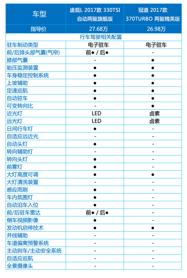 途观L主要的优势在于“灯”,远近光均为LED光源的自动大灯,并且带有随动转向功能,还有前雾灯和日间行车灯,这些都是最低配冠道所没有的,除了这些之外,途观L还有一些很实在的配置,例如非常省心的感应雨刷功能,前后驻车雷达加上倒车影像,妈妈再也不用担心你的倒车入库了,至于提升逼格就交给车内氛围灯和自动泊车吧。