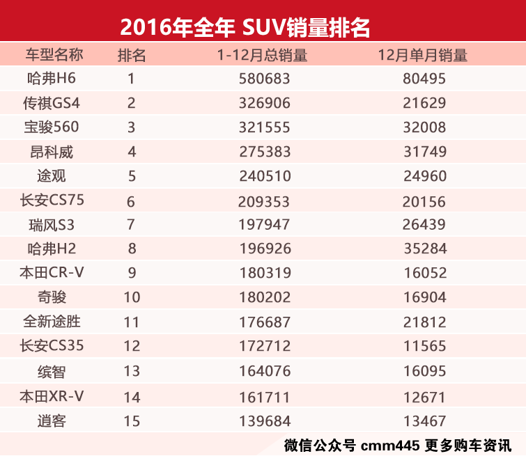 万众期待的2016年SUV全年销量已经出炉!在过去的2016年里面有众多SUV车型以惊人的销量数据让我们目瞪口呆,哈弗H6在12月销量甚至达到了80495辆!