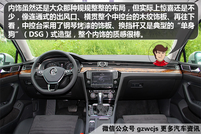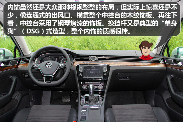 内饰虽然还是大众那种规规整整的布局,但实际上惊喜还是不少,像连通式的出风口、横贯整个中控台的木纹饰板、再往下看,中控台采用了钢琴烤漆的饰板、换挡杆又是典型的“单身狗”(DSG)式造型,整个内饰的质感很棒。值得称赞的是迈腾把全液晶仪表板保留了下来,不像途观L那样把它阉割掉,这可是十分炫酷的装备啊。