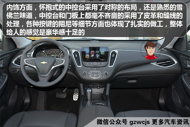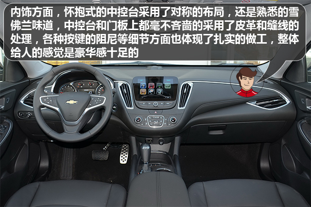 内饰方面,怀抱式的中控台采用了对称的布局,还是熟悉的雪佛兰味道,中控台和门板上都毫不吝啬的采用了皮革和缝线的处理,各种按键的阻尼等细节方面也体现了扎实的做工,整体给人的感觉是豪华感十足的,已经跟当年做工粗糙的传统美系车划清了界线。多媒体系统也搭载了通用自家的安吉星系统,导航和手机互联等功能都有搭载,不用担心。
