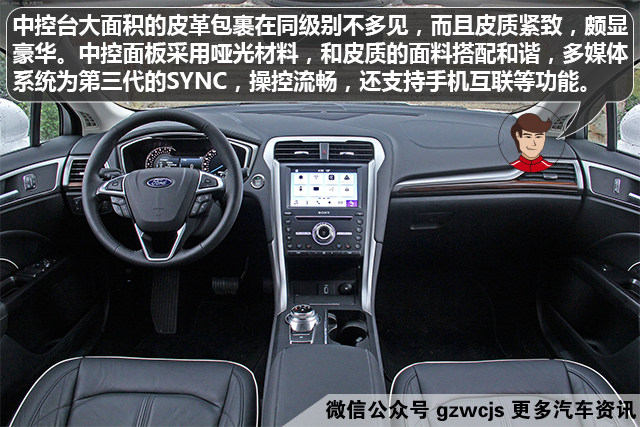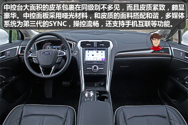 说到蒙迪欧的内饰,总结来说就是两个字:实在。中控台大面积的皮革包裹在同级别不多见,而且皮质紧致,颇显豪华。中控面板采用哑光材料,和皮质的面料搭配和谐,多媒体系统为第三代的SYNC,操控流畅,还支持手机互联等功能。少有的是下方还配备了索尼家的CD机,虽然现在听CD的人不多,但是对于音质有要求的人来说,这可是大大的方便。