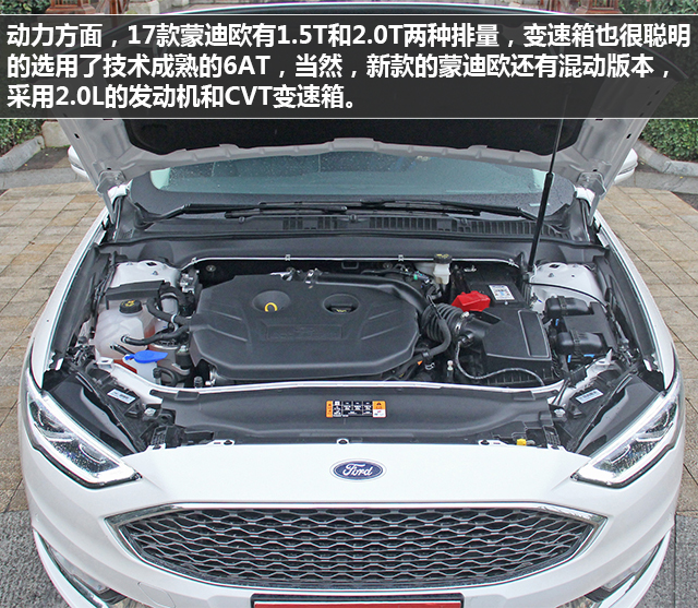 动力方面,17款蒙迪欧有1.5T和2.0T两种排量,变速箱也很聪明的选用了技术成熟的6AT,当然,新款的蒙迪欧还有混动版本,采用2.0L的发动机和CVT变速箱。实际行驶中,1.5T的发动机能提供181Ps的最大马力,涡轮介入后还是能感受到一定的爆发力,中段的动力是表现最积极的,这也是大部分小排量涡轮的特性。