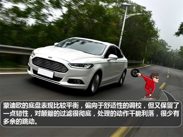 蒙迪欧的底盘表现比较平衡,偏向于舒适性的调校,但又保留了一点韧性,对颠簸的过滤很彻底,处理的动作干脆利落,很少有多余的跳动。而车厢的静谧性又是另一个有点,试驾过程中,即使开到120km/h的高速,蒙迪欧对路噪和风噪的抑制都很到位,整体的NVH水平很高。