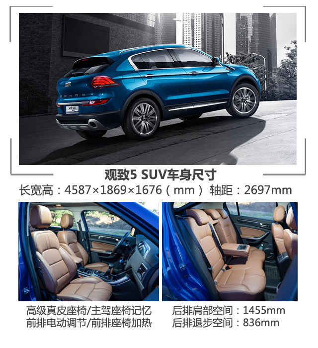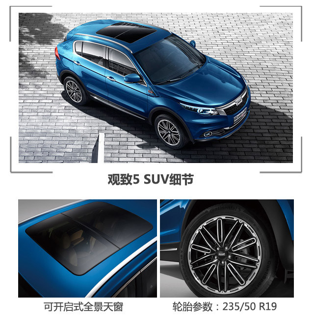 老司机选车讲究设计与品质相结合,毕竟春节期间与亲朋好友一块出行,总会遇到车比车的情况。观致5 SUV首先就会给人很大气的感觉,下压的车顶流线和深邃的腰线颇具运动感。其细节设计也经得住推敲,比如鲨鱼腮式立体前大灯+三光导立体尾灯的组合就具备很强的辨识度;同时尺寸不小的钻石切割式轮毂、复合式车身色扰流板以及全景天窗的配备也能在档次感上提升一大截。