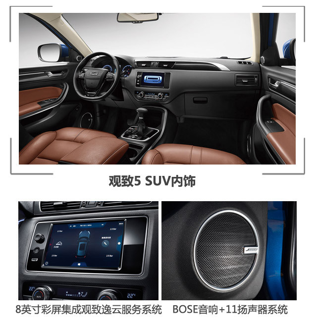观致5 SUV的外观给人奔放的感觉,内饰则回归内敛,走的是简约时尚风。用料方面可圈可点,采用的材料均达到欧盟标准,因此即便是新车也不会有什么异味。中控台的8英寸彩屏是科技的担当,集成观致逸云服务系统,不仅能够随时随地了解爱车状况,还能与车友进行互动并分享用车生活,算得上是目前最为优秀的车联网系统之一。此外还有个很显豪华的配置便是BOSE音响,全车共搭配11个扬声器系统,这对于喜爱音乐的朋友们来说确实是一个福音。