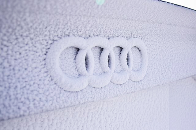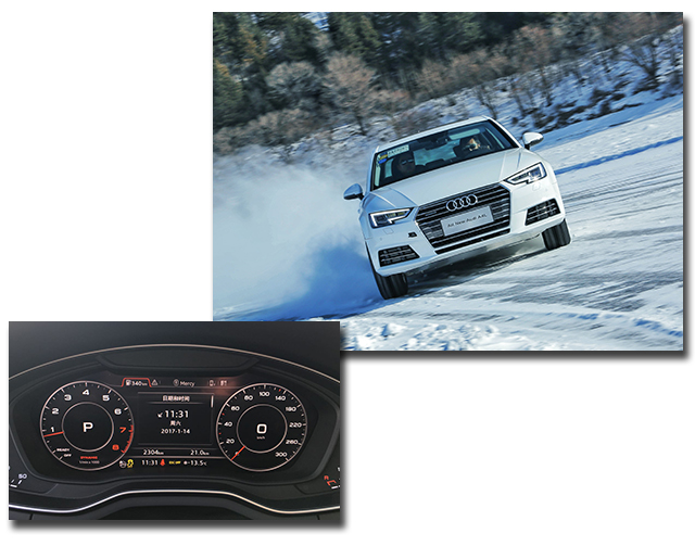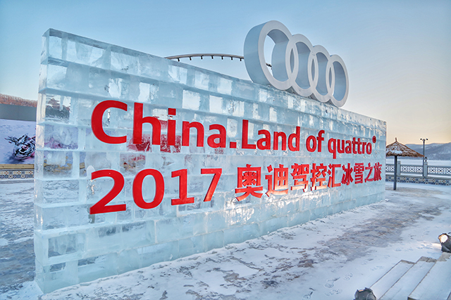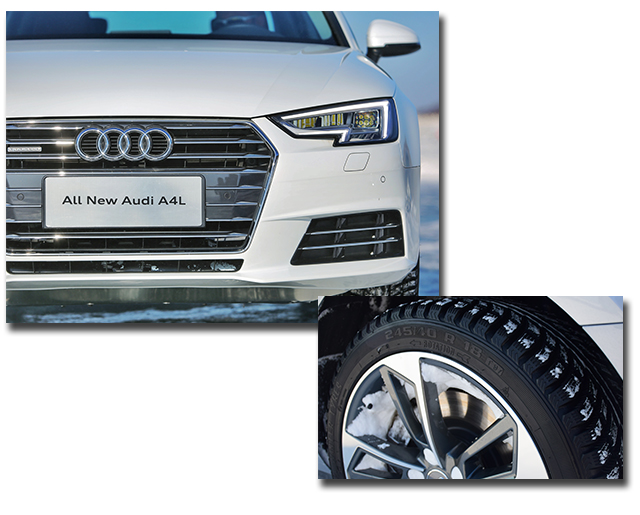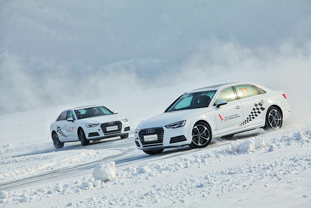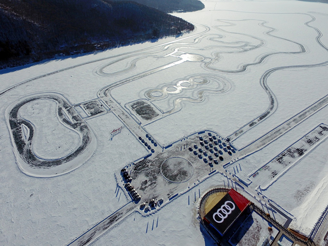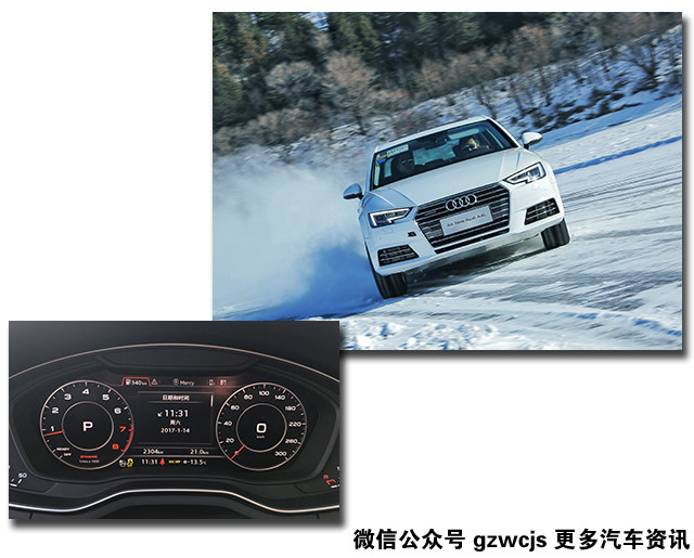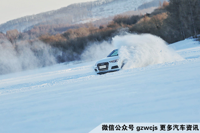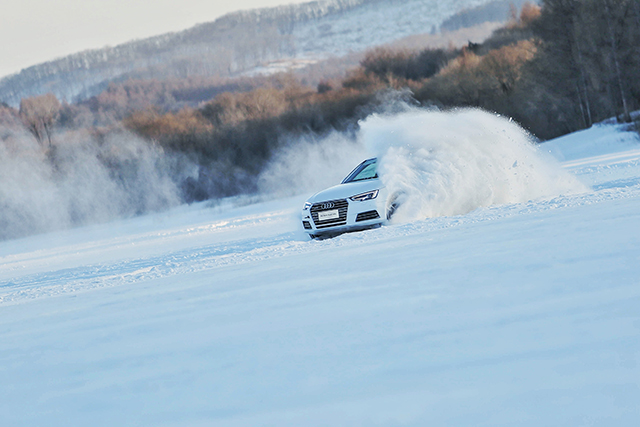 本次试驾的重头戏,是充满刺激和挑战的冰面漂移。在极寒封闭的冰地场所里,开设了如椭圆漂移场地、蛇形练习场地,以及用于进阶课程的综合赛道,但毕竟是在附着力极低的冰面上,车速稍微一快,都有可能引起车辆打滑、甩尾。所以,冰面上甩帅除了要有抓地性能更好的雪地钉胎,还必须是搭载quattro全时四驱的奥迪A4L车型。