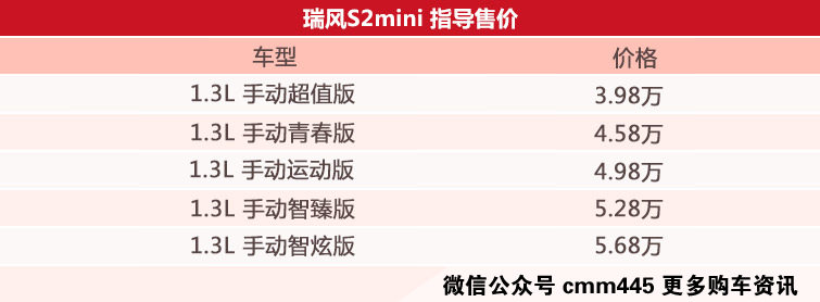 作为一款小型SUV,瑞风S2mini的售价比较低,3.98万就可以买到一款离地间隙180mm的小型SUV,对于有走烂路需求的人来说还是很划算的,但是空间小/配置低也是要直视的问题(3.98万的车型没有ABS),因此在小编看来如果你是喜爱高高的视野或者有走烂路需求的人,那么选择瑞风S2mini倒还不错,不过家用的话,小编更加推荐宝骏310。