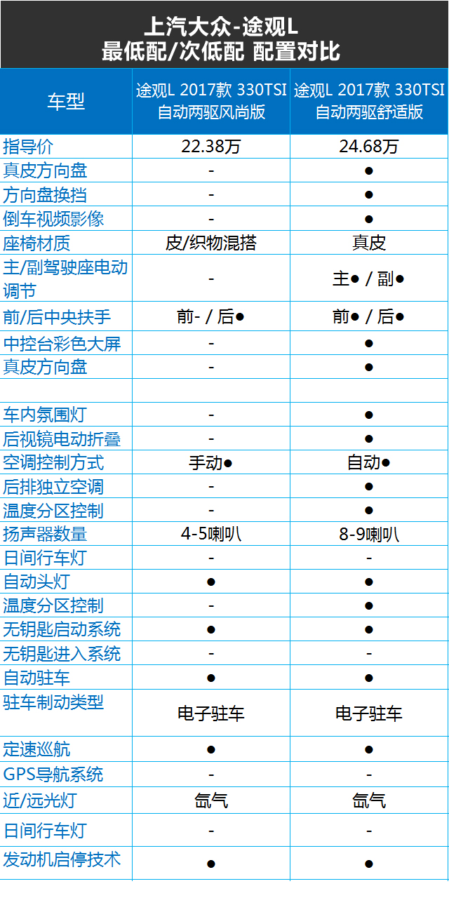 确实,在配置方面途观L和冠道、昂科威相比,竞品车型更为厚道实在一些,不过有时候配置的多少,也是看个人的购车需求,同样也不能决定一辆车的好坏,而途观L的次低配的配置对于教授这个老司机来说足够了。