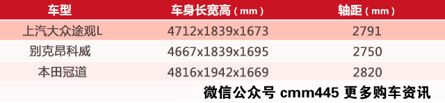 从数据中不难看出,在这三款车中,途观L的轴距仅次于本田冠道,上文说道,途观L国产化以后比海外版本增加了110mm,而这段长度是完全给予了途观L的后排空间的,所以在空间尺寸上,途观L的优势非常明显,内部空间表现确实比昂科威要出色一些。