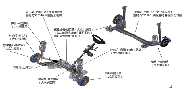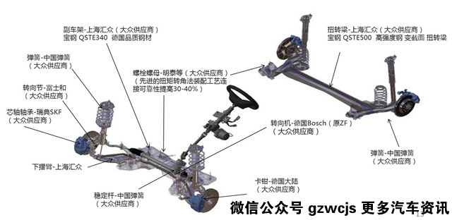 前麦弗逊 + 后扭转梁悬架普遍应用在该级别车型中, ZS的前悬架采用了6点连接(竞品常见为4点),以保证车辆更好的操控性和舒适性;后悬架为“H型”加强版扭梁,提高操控精准度的同时还增加了空间利用率。底盘好不好,调校至关重要,ZS的底盘由保时捷底盘调校团队和上汽资深专家共同完成,以保证ZS拥有同级里最具质感的底盘。