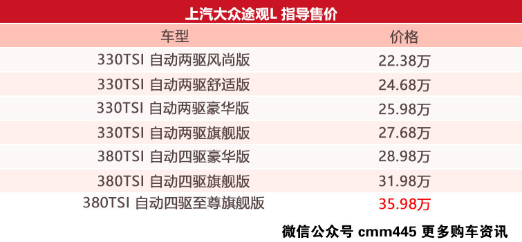 日前,上汽大众全新的中型SUV--途观L正式上市了!它定位为一款大5座的中型SUV,并且搭载1.8TSI和2.0TSI两种动力总成,分别命名为330TSI、380TSI车型。