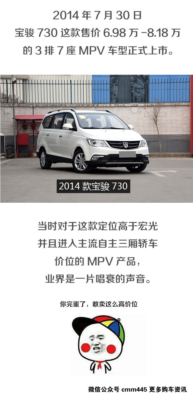 其理由无外乎是价格太高人们更加愿意选择一款三厢轿车,不过730上市首月销量就突破1.2万证明了宝骏的眼光,也证明了只要产品足够优秀人们是完全能够接受MPV产品。