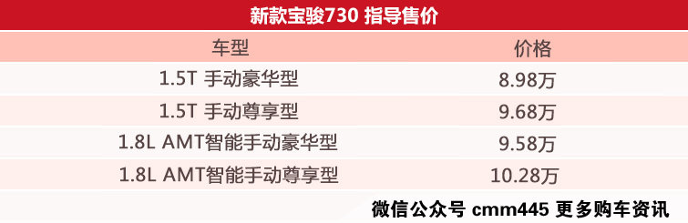 此次730中期改款车型共上市4款车型,分别是两款1.5T手动车型,两款1.8L AMT自动车型。而这次中期改款的2017款宝骏730升级的重点还是在内外配置上。