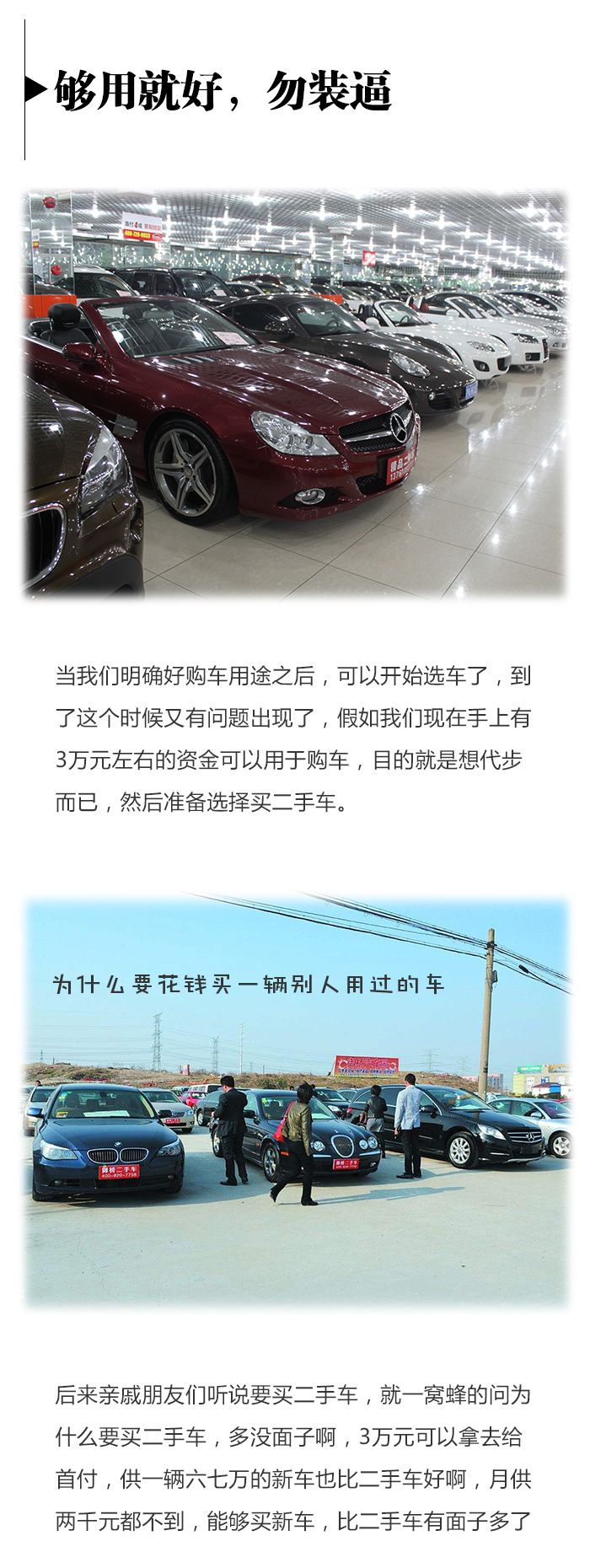 没错,3万元的首付的确能够供一辆六七万的新车了,但是不要忘记,我们的目的是什么,仅仅代步而已,再说,我们是给自己买车,又不是给亲戚朋友买车,又何必背上每个月一千多块的债务呢,买车一定要在自己的能力范围内,千万不要打肿脸充胖子。