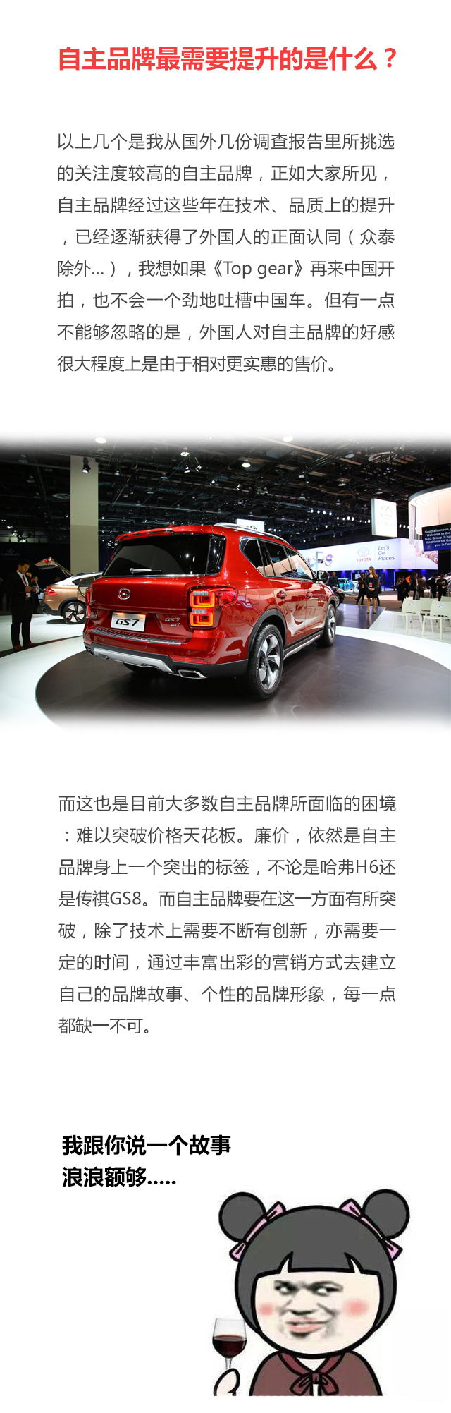 幸好,我们已经看到了自主品牌已经开始在技术创新上发力,比如长安自主研发的蓝鲸2.0TGDI发动机,其动力水平已经看齐现代起亚、斯巴鲁等一线国际车企的同排量发动机;观致正在研发的无凸轮轴发动机(QAMFREE),有望为现时的发动机技术带来革命性的改变等等。总之,自主品牌正以前所未有的强势,迅速地融入到国际一线的汽车工业当中。希望有一天,“中国汽车”能够替换“自主品牌”。