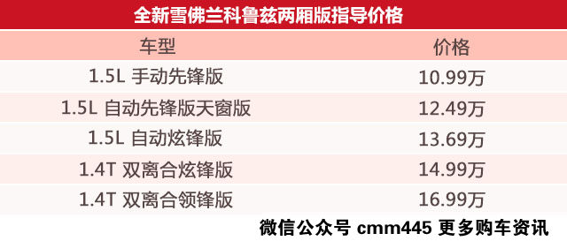 2月6日,上汽通用正式宣布旗下雪佛兰科鲁兹两厢版正式上市,售价区间为10.99-16.99万元。