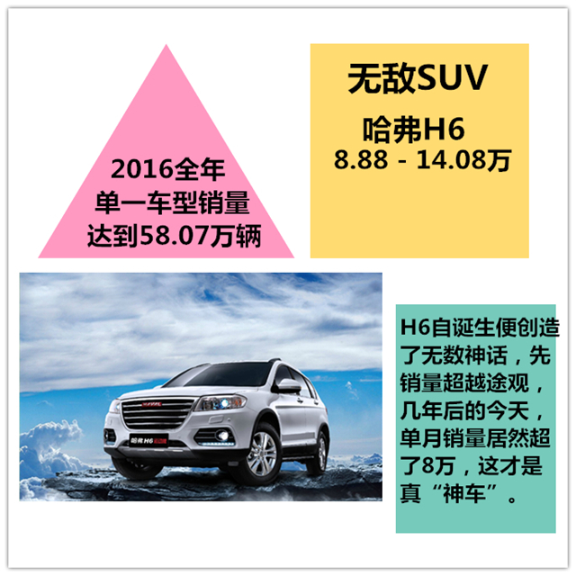 上面这两位则是各自细分市场的绝对霸主,它们的共同点(或者说成功之道)在于,率先抢占了市场制高点,GL8是国内第一个进军中高端MPV的车型,并且顺利发展了十几年;几年前SUV的“火苗”刚燃起时,哈弗(彼时还叫长城)通过逆向当时的“神车”CR - V,以不错的品质和大气的造型迅速揽下SUV的一大片市场,当然多年的皮卡经验也为H6的成功奠定了基础。