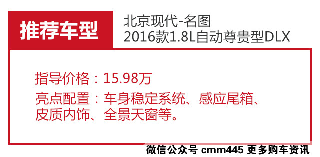 推荐车型是名图的1.8L自动尊贵型,自动变速箱的平顺性要比双离合来得更好,而作为宜商宜家的选择,动力总成的平顺性则显得尤为重要了,为了避免双离合变速箱偶有的顿挫尴尬,出于保险还是选择AT变速箱好了,而且韩系车的市场终端优惠普遍不小,将近16万的指导价到4S店实际考察后或许有个不小的惊喜。