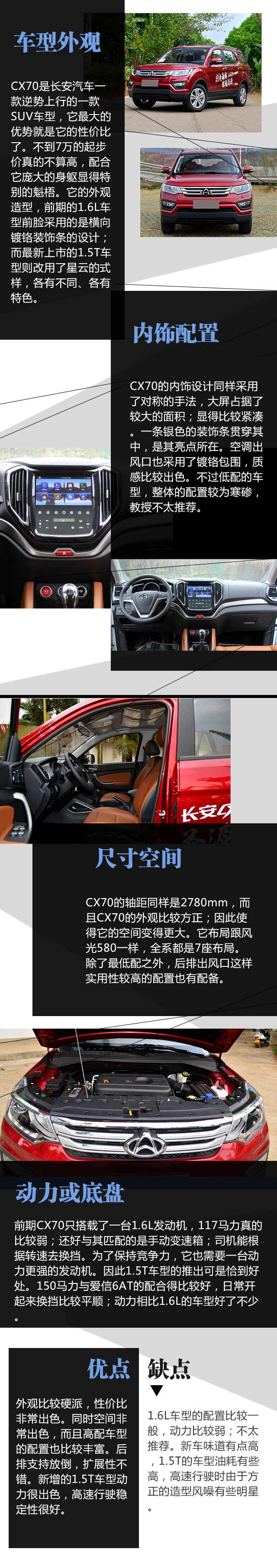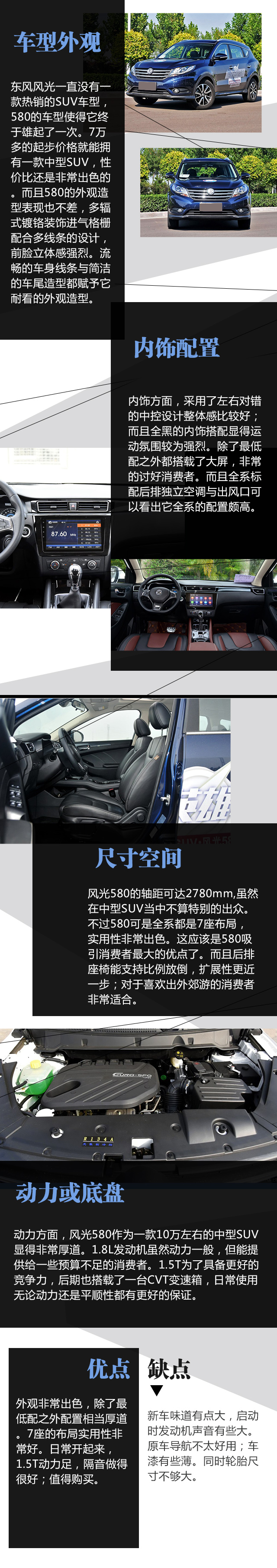 教授总结:教授今天所推荐的是这几款SUV车型,肯定有很多人会问到底哪款最值得购买的。其实教授已经在文章里透露出来了。风光580是最值得购买的,无论外观还是内饰空间配置都是这几款SUV当中最出色的,其次就是长安的CX70了,后期推出1.5T车型之后,竞争力也不差;就是外观有些抄袭的嫌疑。最后的X7外观与空间都不错,但做工上还是与其他两款有些差距。
