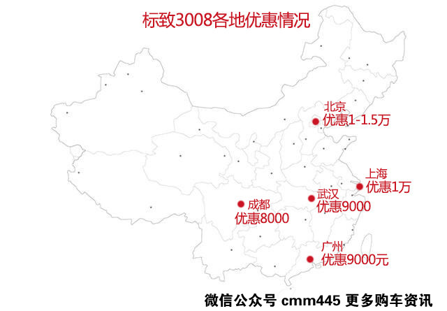 3008的指导价就已经比较低,因此优惠空间并不大,目前各地优惠在8000-1万元左右,标致3008最低配自动挡车型的指导价为14.87万,优惠完后裸车价格也低于14万,据说还有人裸车不到13万就买到了~