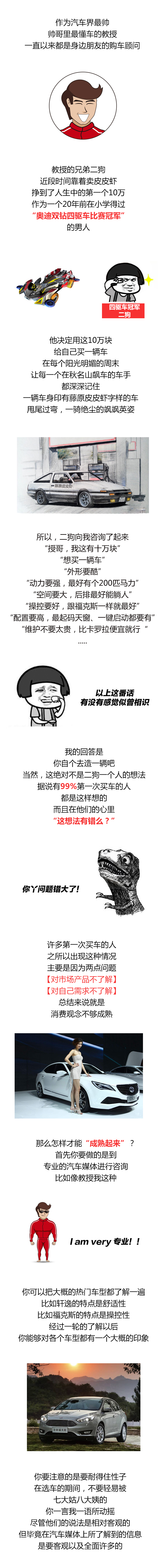 简单来说,先把车的基本知识了解,再把根据自己的预算、需求进行选择,然后再进行试驾。尽管听起来很简单,但做起来却需要花一定的心思。尤其是第一点,许多人还没搞清楚发动机跟变速箱的类型,就匆匆听从别人的说法,下了订单。提车以后,才发觉车是好车,就是自己怎么用都不好使。所以买车这事,千万千万得做好功课,只有这样你才能不在买车以后泪流满面!要是实在不行,你还可以在文章里留言或者在公众号里咨询教授,教授我一定好好帮大家分析分析!最后祝大家,明天就开上奔驰宝马!