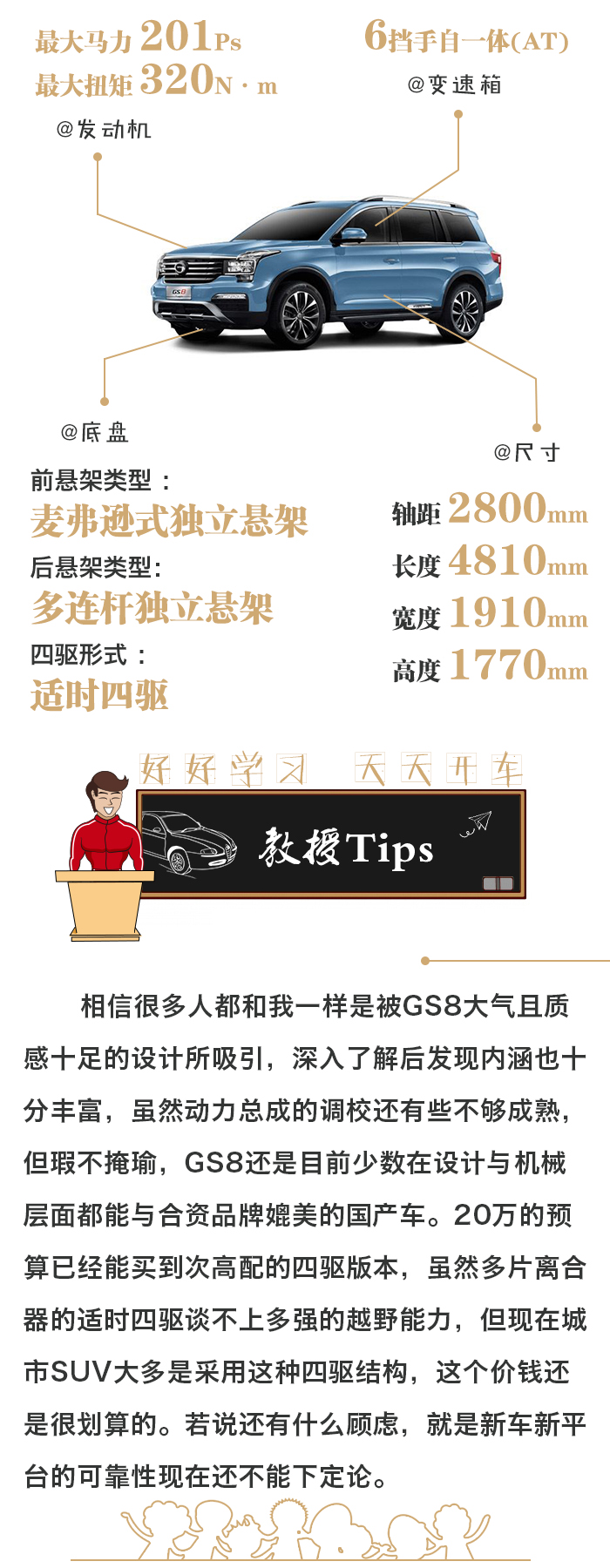 和其他国产车一样,GS8的配置也相当厚道,在这里罗列了我觉得比较实用的八项配置,全景天窗真的很敞亮,胎压监测开着放心,定速巡航高速省事,全景摄像头挪车很实用,车内氛围逼格满满,座椅通风加热则是为屁股着想。这些配置在这款320T四驱豪华智联版上均有配备,但其中只有定速巡航是全系标配的,所以为了四驱和这些配置,20万买个高配还是物有所值的。
