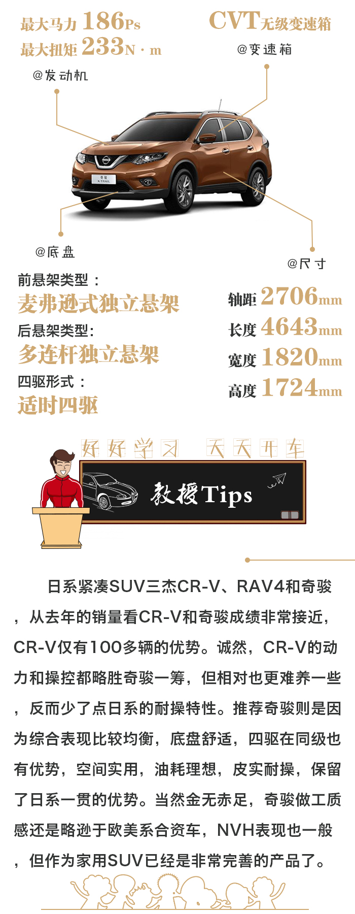 在这个级别的合资SUV中奇骏的配置已经算是比较厚道了,2.5L CVT豪华版 4WD和2.5L CVT运动版 4WD终端售价相差1万左右,主要差别就是多了LED灯组,如果预算比较紧就没必要了,所以推荐了豪华版。其他依然是那几个比较实用的配置,这个价位基本都能配备,其中感应后备箱除了实用性之外,用起来逼格还是挺高的,而中央差速器锁的搭载则让奇骏的通过性在同级中比较突出。而上述的这些配置都不是全系标配,所以预算能到20万的话,买奇骏还是不错的选择。