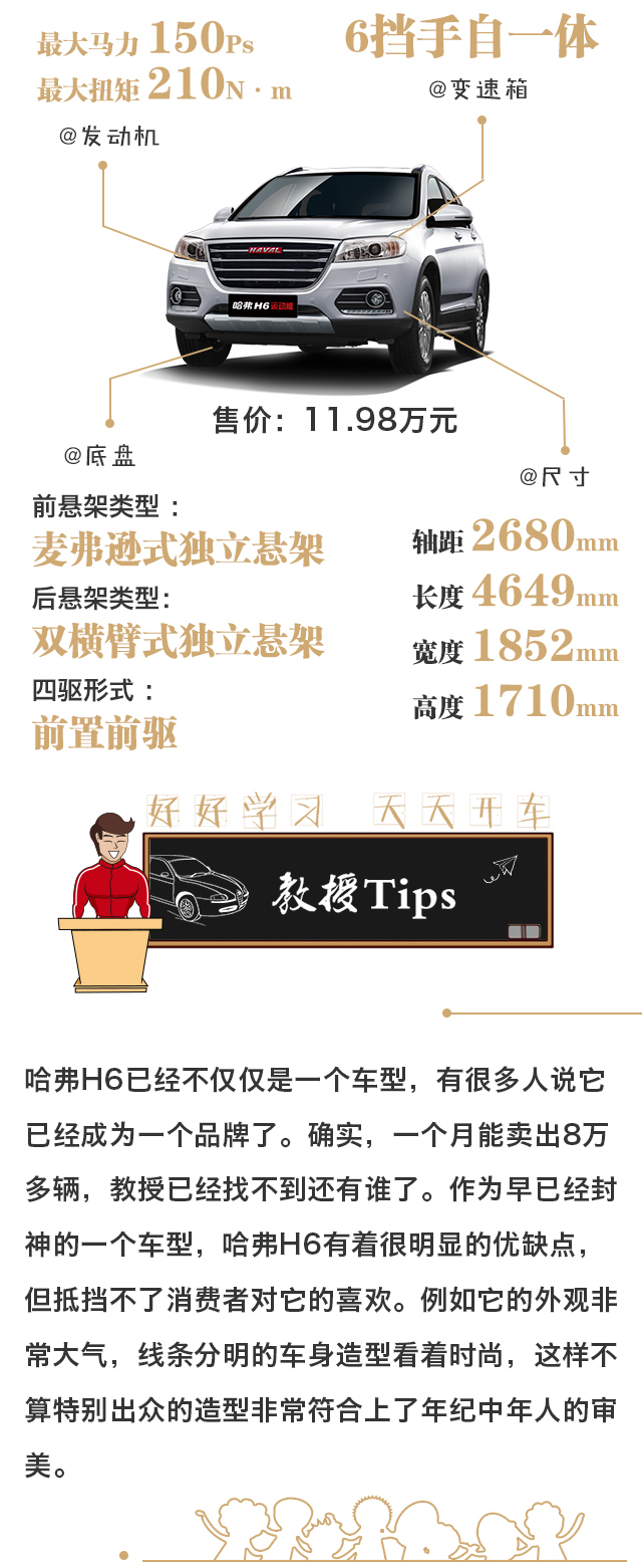 哈弗H6除了外观耐看之外,配置丰富也是它最大的优势。今天教授所推荐的这个车型,不到12万的价格比其它两款车都要丰富,性价比更高。而且大多数看中都是看得见的配置,对于内在的需要在以后的时候才会慢慢了解。哈弗H6被人诟病最多的就是它的动力匹配较差、油耗偏高;不过教授相信厂商看中那么红火市场销量,肯定不想后期由于口碑拖累了市场表现的,未来肯定会有所优化的。