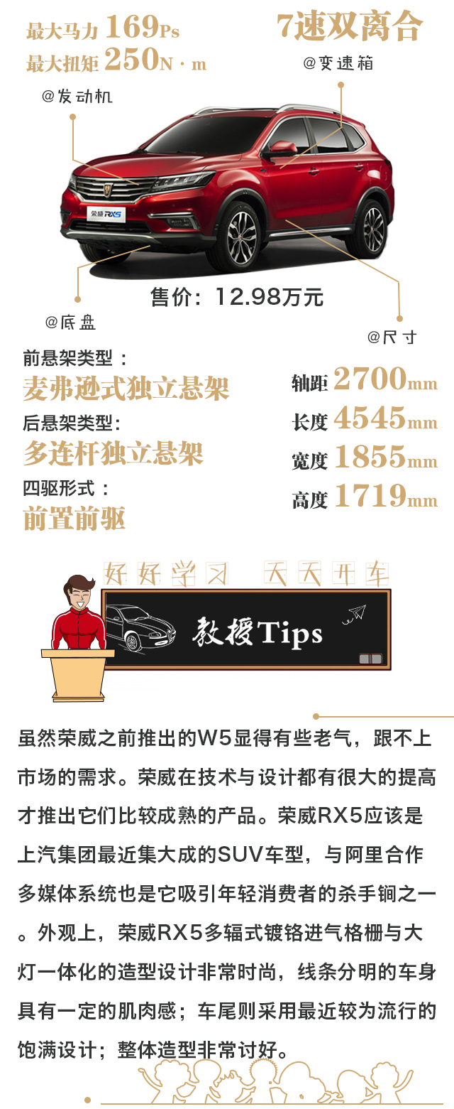 相对而言,荣威RX5目前是最具噱头的,无论它的外观造型还是它的物联网概念都非常火热;而且就这几款车型来说,它的新鲜度也较高;后发之势较强。而传祺GS4的外观造型同样是设计非常年轻的,而且它出色的底盘也赋予了它较强的操控,但就是配置不算很出众。最好的哈弗H6就是外表看起来什么都好,很难挑的出它的毛病;但开起来其实动力匹配不太好;油耗往往也非常高,这是消费者需要考虑的一个地方。