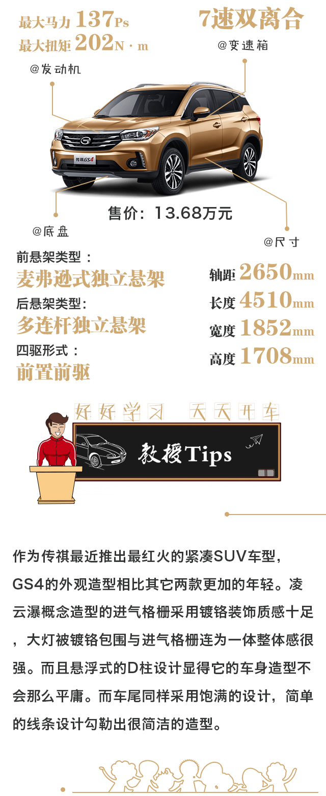 1.3T的动力不算太出色,而且最近推出的6AT版本在1.3T车型也没有身影。虽然动力一般,接近14万的价格豪华型配置非常丰富,5个安全气囊、ESP、上坡辅助与胎压检测都有搭载,安全性更高一筹。而且GS4比较出色的就是它响应很快的底盘,应该是今天推荐几款SUV操控最好的车型。