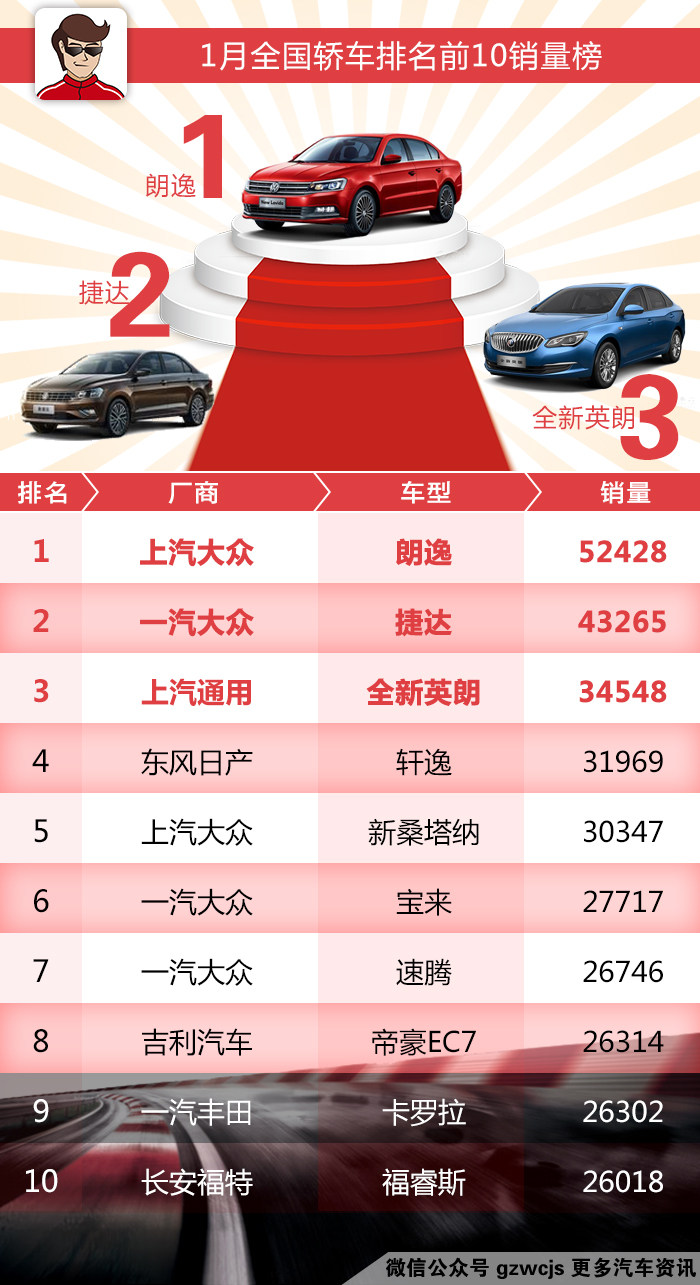 虽然说每次轿车销量排行的前几名都是那么的几款车,但是也不代表排名于前10之后的车型,竞争不激烈。从今年1月份的角度来看,部分在去年上市有几个月的车型,在销量方面慢慢地追赶上来了,例如: