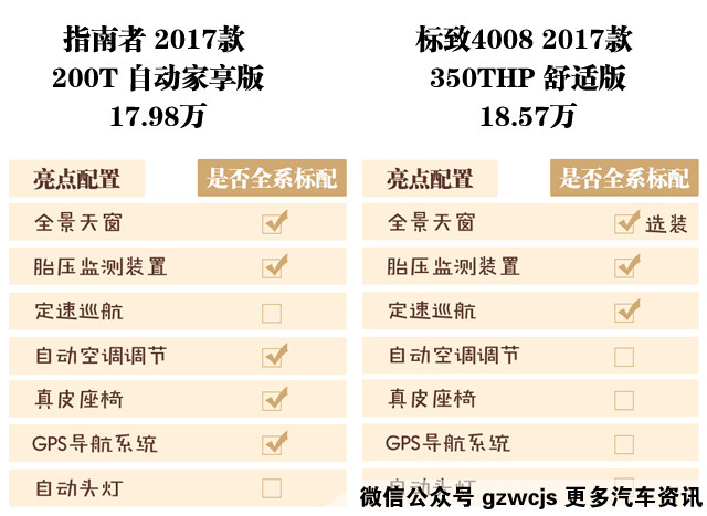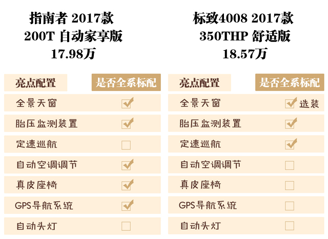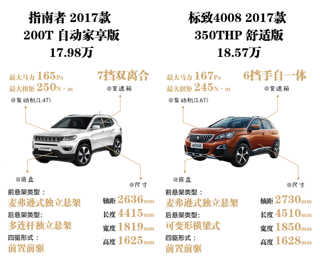 教授推荐:Jeep指南者2.4L顶配车型更值得入手;标致4008选择1.8T低配更实惠一些。