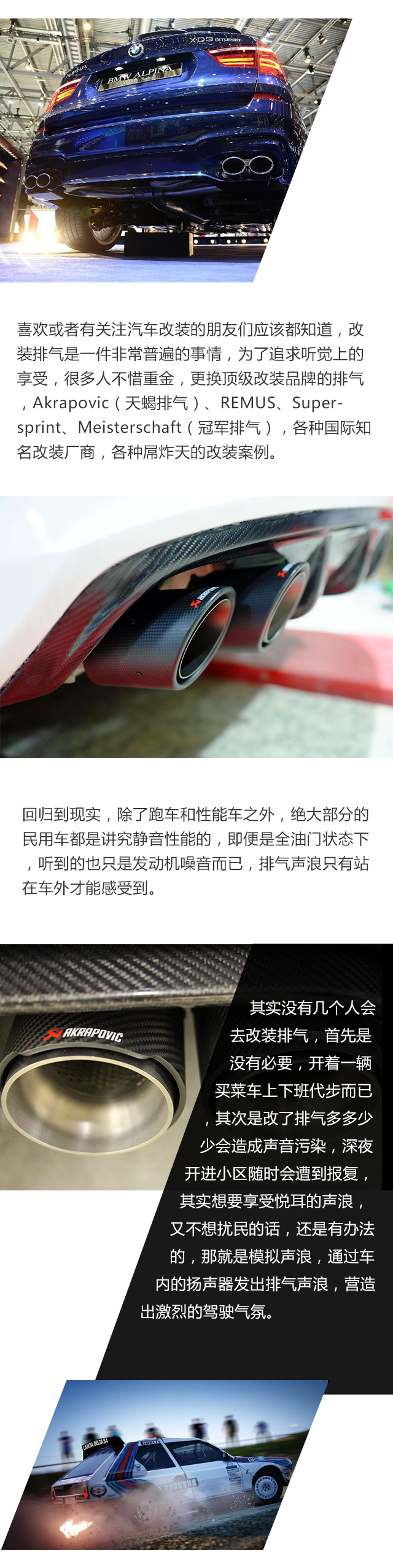宝马i8就是一个很好的例子,一辆使用了1.5T涡轮增压三缸发动机与电动机的混动跑车,无论是怎么激烈驾驶,在车外听到的声浪就像是一辆小钢炮而已,可是坐进车内,却能够感受到大排量V8引擎的咆哮,就像是走进了演奏厅,享受美妙的音乐。