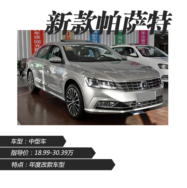 作为年度改款车型,新款帕萨特依旧保持了现款的外观设计,新车将提供三种不同排量发动机,根据配置的不同共推出七款车型。新车取消了280TSI手动尊雅版以及3.0 V6旗舰版车型,最低配车型将为280TSI DSG尊雅版,而最高配车型为380TSI DSG旗舰版。除此之外在其他车型中配置将小幅升级。