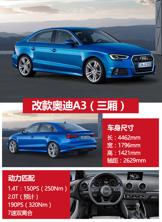 改款A3此前已经多次亮相,预计上市不远了。新车的改变主要有两方面,一方面是外观细节年轻化,采用新的家族语言,向新A4L靠拢;另一方面则是有望用第三代EA888的2.0TFSI发动机取代现在的1.8TFSI发动机,采用的是低功率版,最大功率140kW(190PS),最大扭矩320Nm,匹配7速双离合。