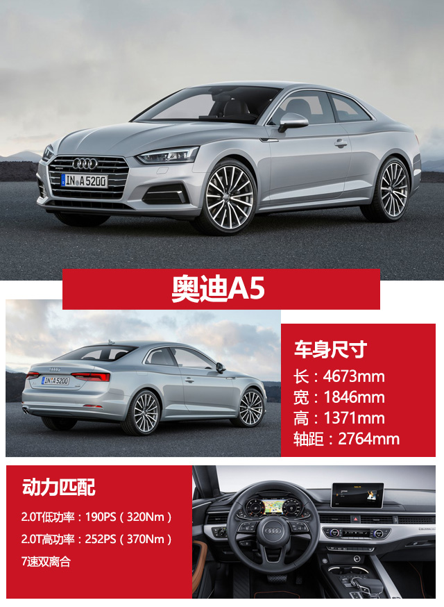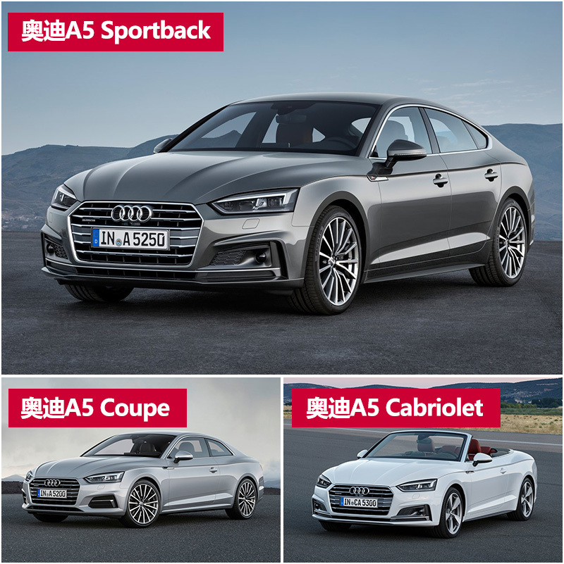 这款新车在2017年度风云车评选首轮投票中也是脱颖而出,可见全球媒体对这款车的肯定。新一代奥迪A5大家可以看作是A4的轿跑版车型,它依旧分为Coupe双门版、Sportback五门掀背版和Cabriolet敞篷版。Coupe运动感更浓厚,Sportback的后排和行李厢空间有提升,Cabriolet软顶敞篷版也很拉风。