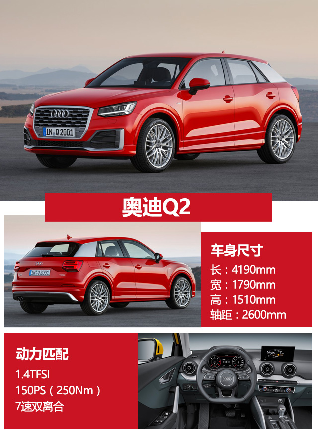 我想,奥迪Q2的质量也会有保证。新车采用MQB平台,高尔夫、A3都是此平台的产物,而Q2是第一款此平台的奥迪SUV。长宽高为4190×1790×1510mm,轴距为2600mm,和大哥Q3相比足足小了一圈,不过,轴距却仅仅只短了3mm,从硬件条件上来看,Q2的空间应该比想象中要好。