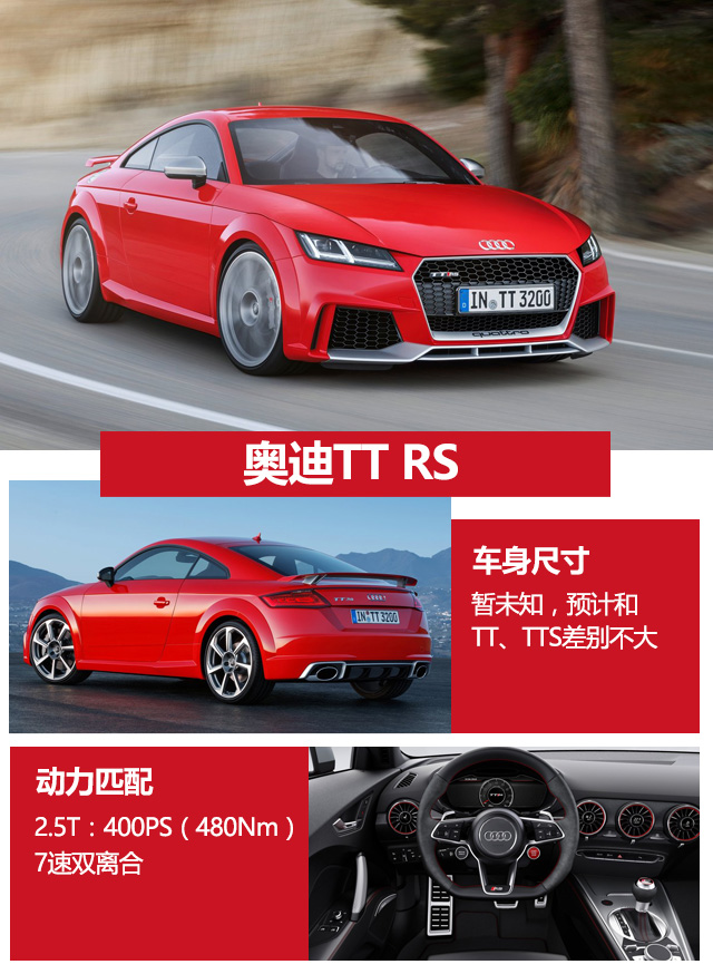 它搭载2.5T五缸涡轮增压发动机,最大功率294kW(400PS),最大扭矩480Nm,匹配7速双离合变速箱和quattro四驱系统,TT RS Coupe百公里加速只需要3.7s,TT RS Roadster只需3.9s。比TTS足足快了1s。
