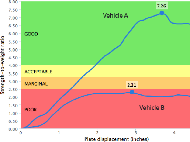 IIHS规定了,在车顶变形量不超过5英寸(约合12.7cm)的过程中,车顶所承受的压力超过4倍车重的,就能够获得Good(优秀)的评价等级,在3.25倍至4倍之间的,则获得ACCEPTABLE(良好)的评价等级;在2.5倍至3.25倍之间的,则获得MARGINAL(中)的评价等级;在2.5倍以下的则获得POOR(差)的评价等级,也就是下图这样表所示。